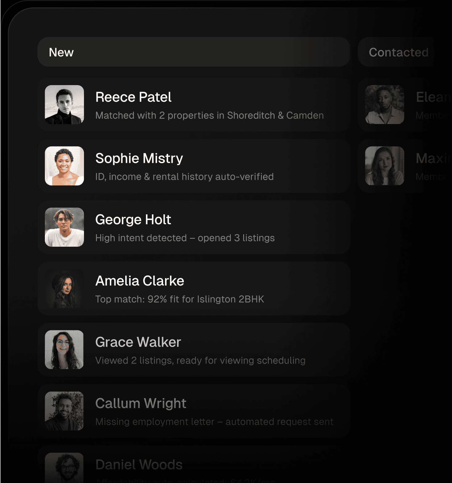 Communicate with applicants, book viewings, move tenants through pipelines, automate follow ups, and sync documents. Onboard qualified tenants faster with verified intent and structured data—reducing void periods with less admin.