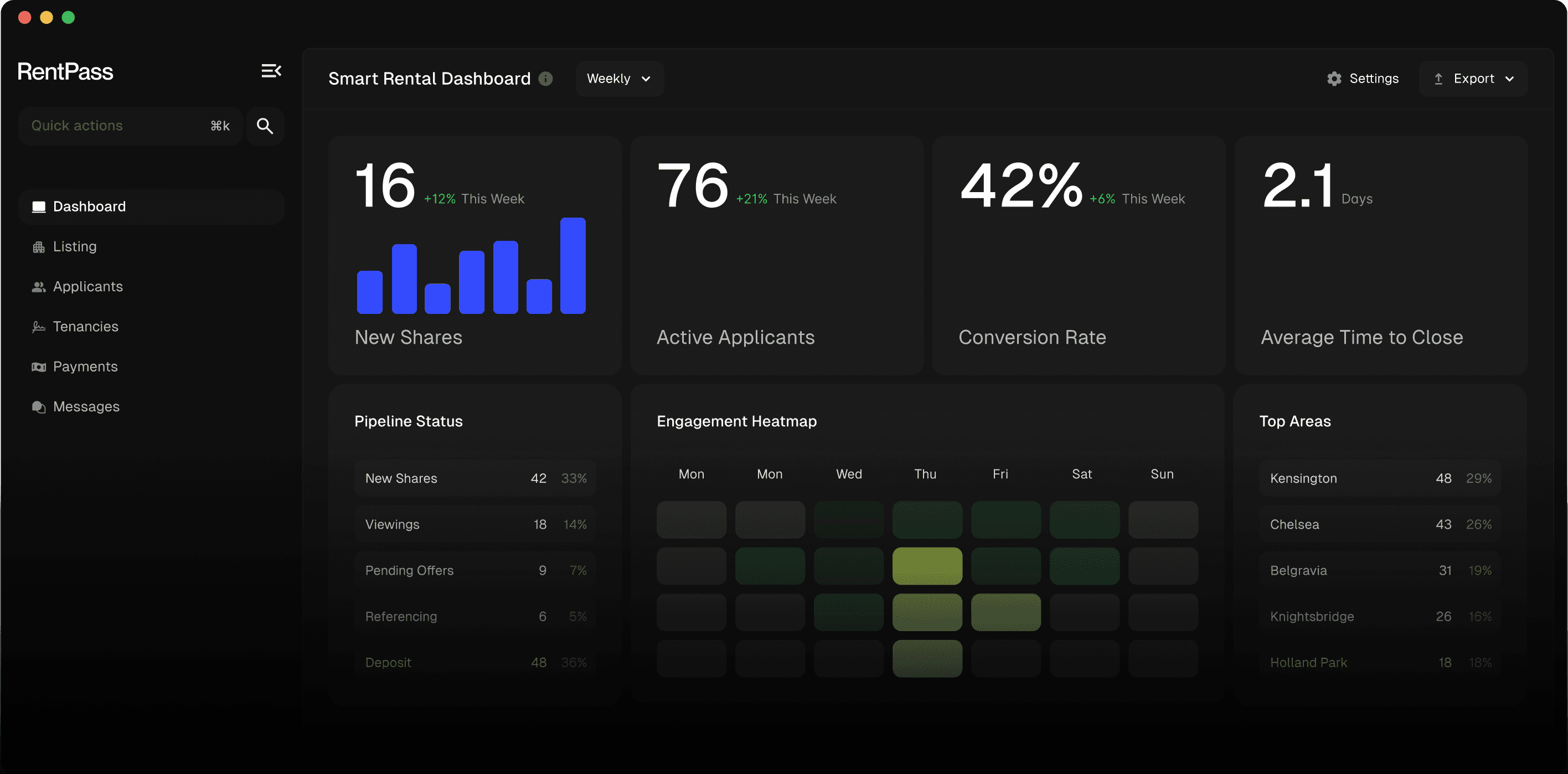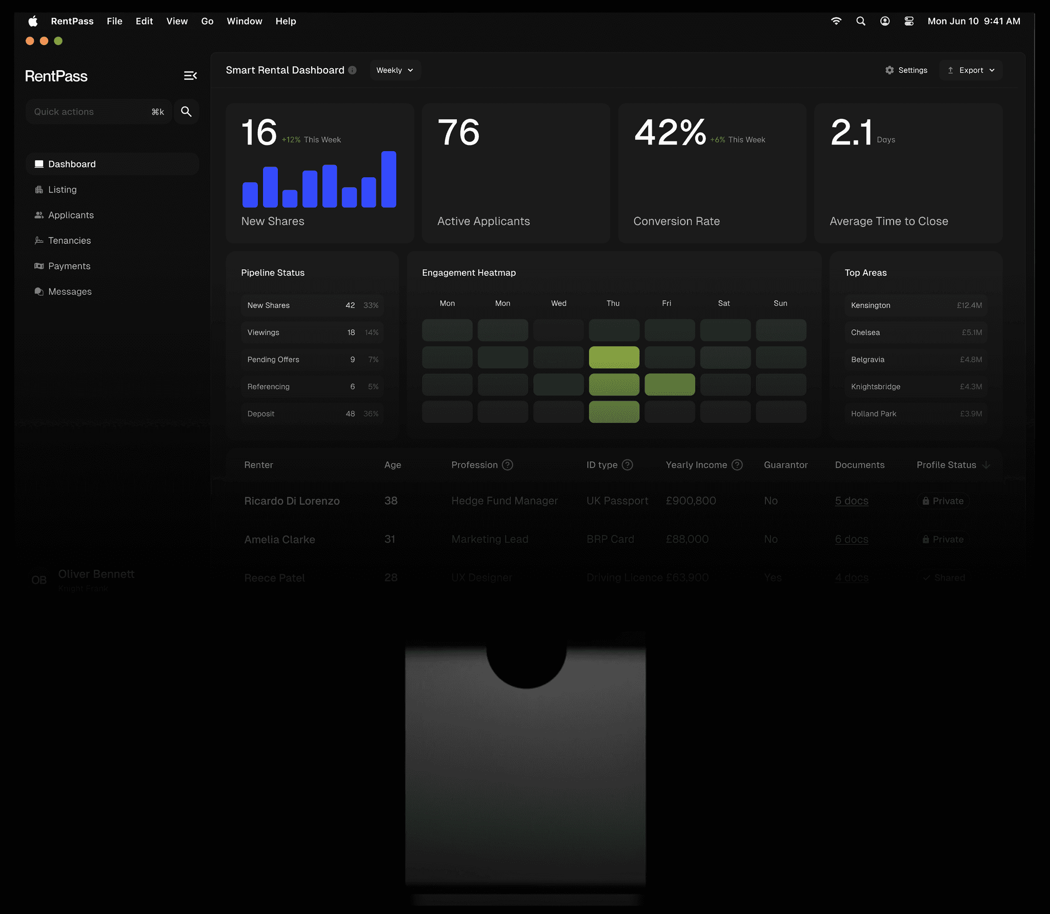 RentPass isn’t just a verification tool; it’s your complete lettings platform. Capture demand, manage applicants, close deals, and reduce void periods all within the RentPass CRM.