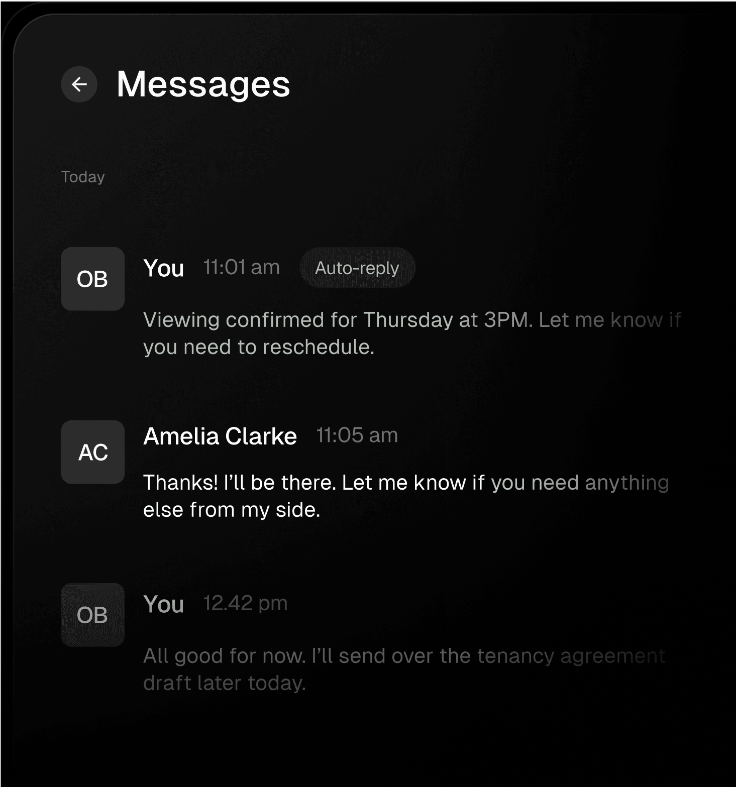 Centralise all your conversations across renters and landlords. Use smart templates, automate viewing follow-ups, and send triggered document requests to keep every interaction clear, fast, and logged.