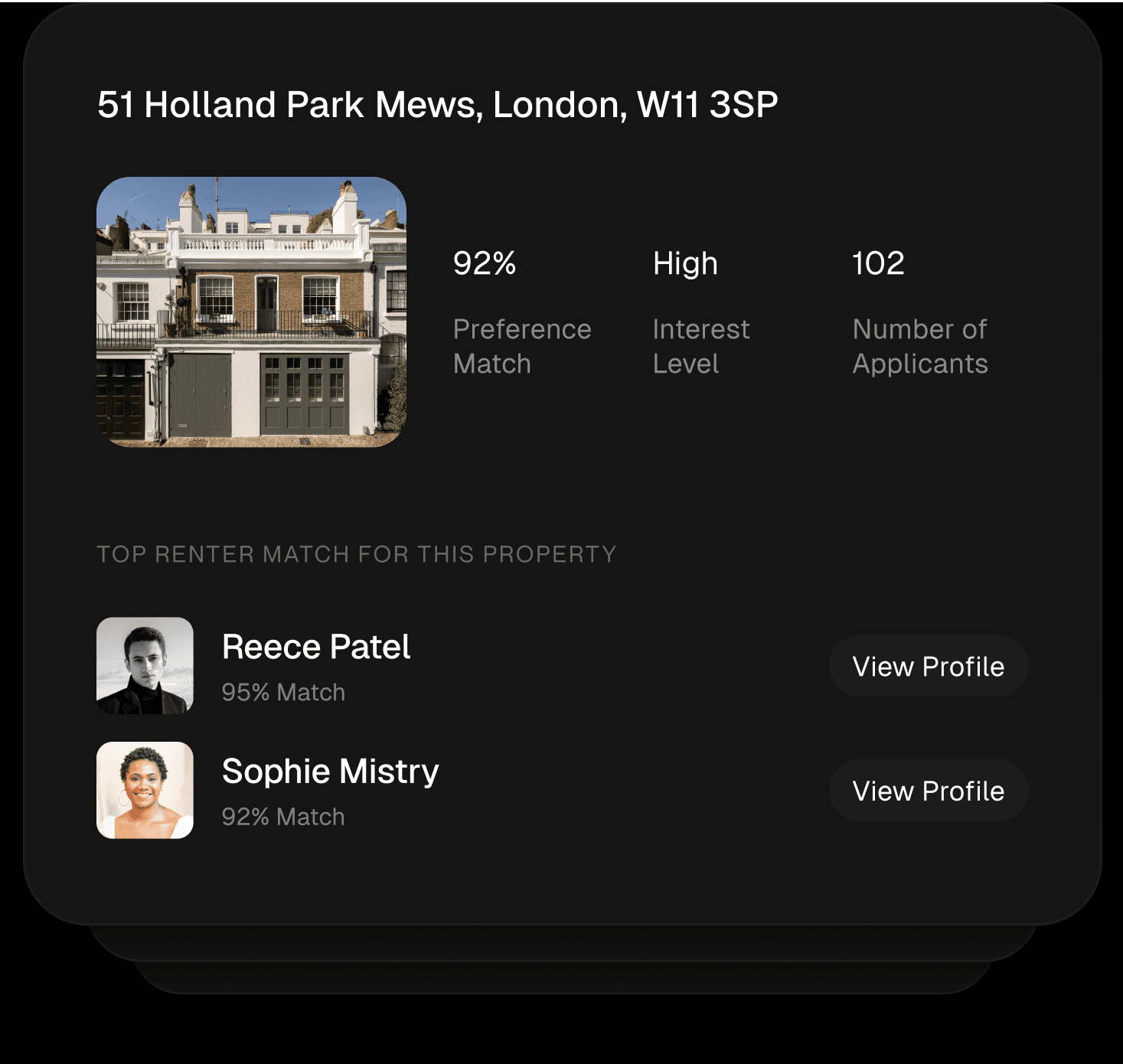 Turn preference data into dealflow. As renters build and share their criteria, you get real-time alerts on matching leads. View preference scores, interest levels, and application status, then book viewings or send contracts in one click.